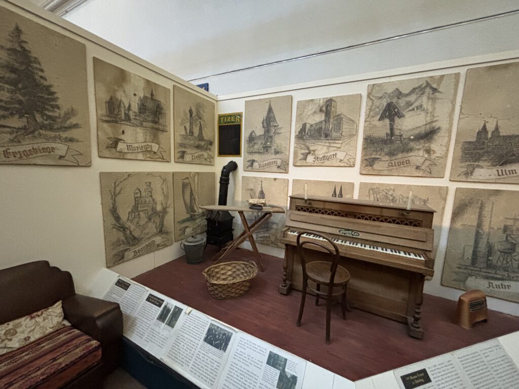 Meeting new people is important in any relocation. I’ve joined the local branch of Toastmasters International, attended my first book reading, found a local choir. Stirling is the home of the Smith Art Gallery and Museum. I had heard they had an exhibition related to my book, so I had to find out more. One of the POWs of the real-life Camp 64 painted a series of murals and seeing them in the museum was a very tangible link back to my fictional characters. A piano also features in my story, and seeing this old piano there, naturally caused me to find out more about it.